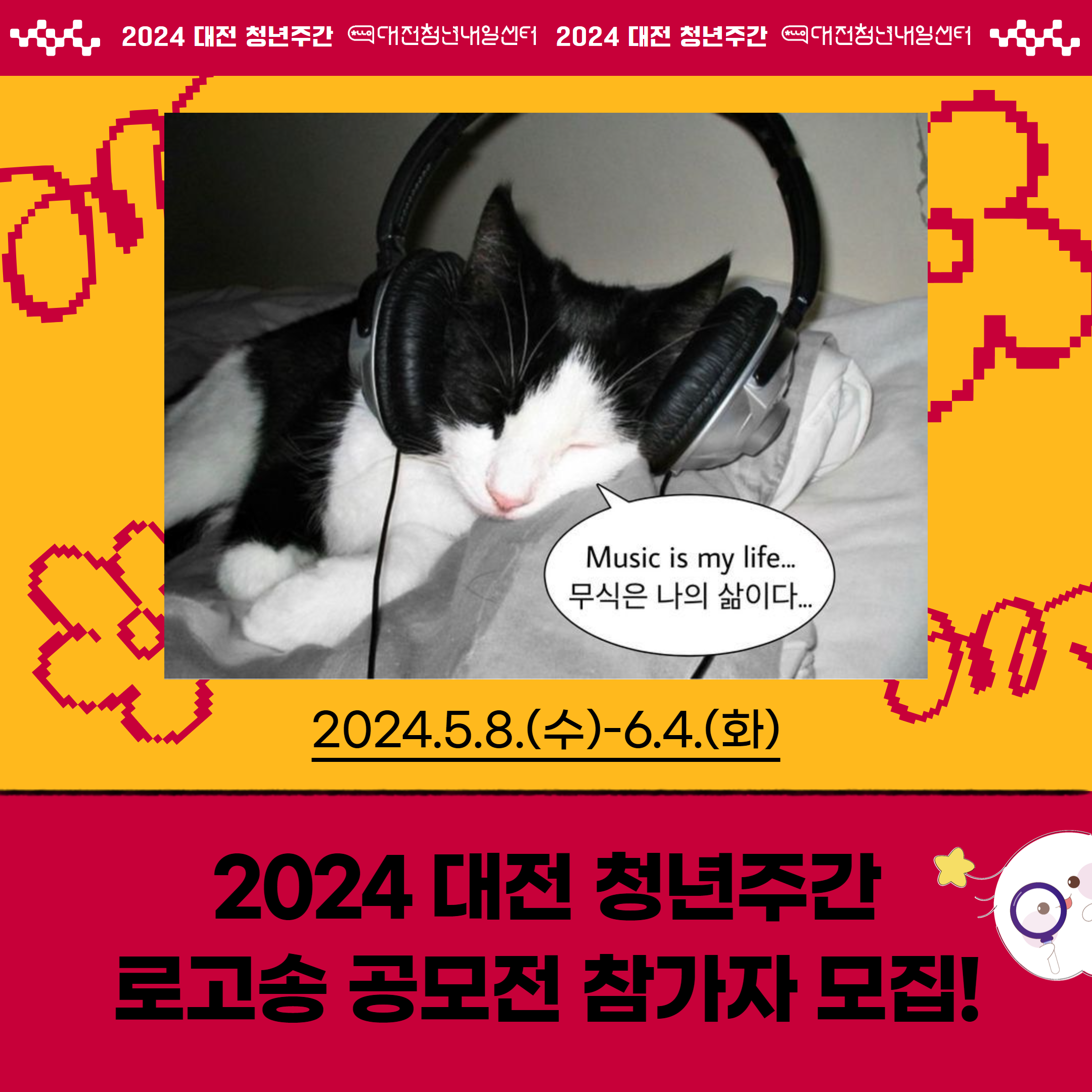 대전청년내일센터는 ‘2024년 대전 청년주간’을 맞이하여 사전 프로그램으로 로고송 공모전을 개최하오니 청년들의 많은 관심과 참여 바랍니다.